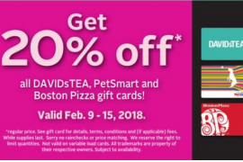 [逾期]Rexall推出最新優惠,購買Boston Pizza/David's Tea/PetSmart禮券(Gift Card)可獲八折優惠 請按此查閱Rexall分店地址 截止日期:2018年2月15日或售完即止...