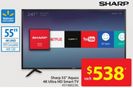[Sold Out]Walmart推出Black Friday特價優惠,精選產品包括: Sharp 55吋 4K超高清LED電視只賣$538 只限2017年11月16日至26日或售完即止...
