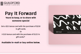 Guildford Town Centre推出最新優惠,購買$125 禮券(Gift Card)即可獲$10額外禮券 詳情請瀏覽Guildford Town Centre網頁 售完即止 *另外Metrotown及Tsawwassen Mills同時提供此優惠...