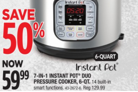 Canadian Tire 推出限時優惠:Instant Pot電子壓力煲(7-in-1, 6-quart)只賣$59.99 詳情及門市存貨數量請按此閱覽Canadian Tire網頁 截止日期:2019年12月1日或售完即止...