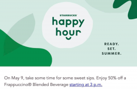 感謝網友Nick報料!於5月9日(星期四)3pm 起,到Starbucks購買任何Frappuccino,即可獲半價優惠,只限已登記的Starbucks會員 只限2019年5月9日...