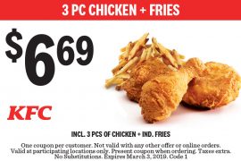 KFC推出Coupon優惠,包括: 3件雞 + 薯條只需$6.69 4件雞 + 薯條只需$7.69 請按此下載Coupon 截止日期:2019年3月3日...