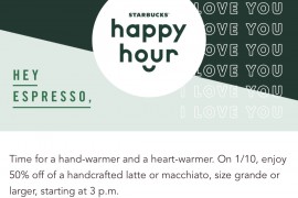 於1月10日(星期四)3pm 起,到Starbucks購買任何Latte/Macchiato可享半價優惠,只限已登記的Starbucks會員 只限2019年1月10日...