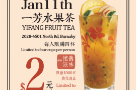 位於Burnaby North Road的一芳台灣水果茶為慶祝開幕誌慶,將於今日(1月11日)推出限時優惠:購買水果茶只需$2 詳情請按此瀏覽一芳台灣水果茶Facebook網頁 只限2019年1月11日或額滿即止 地址:202B-4501 North Rd, Burnab...
