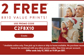 Walmart推出最新優惠:免費兩張8×10 相片沖晒。相片經Walmart網站上載,沖晒後可於Walmart提取,不用郵費。需使用promo code 「C2F8X10」 請按此瀏覽Walmart網站及閱覽優惠細節 截止日期:2022年7月17日或額滿即止