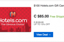 $100 Hotels.com Gift Card只賣$85,Gift Card以電郵發放,不用任何運費 詳情請按此瀏覽ebay.ca網頁 售完即止