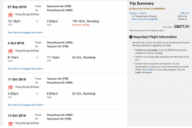 Expedia:溫哥華 – 香港 – 台北機票只賣加幣$578(連稅)