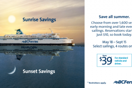 BC渡輪於5月18至9月15日,於指定航班推出單程船票(乘客+汽車船票)$39.95優惠 詳情請按此瀏覽BC Ferries網頁 請按此閱覽航班詳情 截止日期:2017年9月15日 *有少量條件限制
