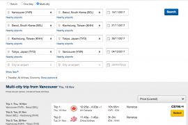 Expedia推出優惠,由溫哥華出發,先去首爾,然後由首爾往高雄,再由高雄飛東京,最後由東京飛溫哥華,所有行程乘搭直航航班,機票價錢連稅為$796.46 請按此登入Expedia網頁 可按此連結直接登入上圖顯示的出發日期 訂票時,請選擇Multiple Destinati...