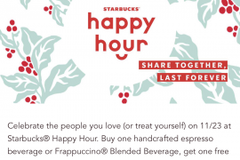 [逾期]于11月23日(星期五)3pm 起,到Starbucks购买任何中杯装或以上Espresso/Frappuccino可享买一送一优惠,只限已登记的Starbucks会员 只限2018年11月23日...