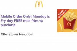 McDonald's推出限时优惠,只要下载McDonald's App (iPhone或Android均可),携同智能电话于今日(6月24日)到McDonald's分店并以Mobile App购买任何产品($1以上),即可获赠免费薯条 至于已下载此App的网友,你亦可享以上优惠
