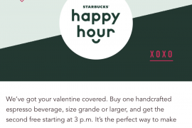 于2月14日(星期四)3pm 起,到Starbucks购买任何中杯装或以上Espresso可享买一送一优惠,只限已登记的Starbucks会员 只限2019年2月14日...