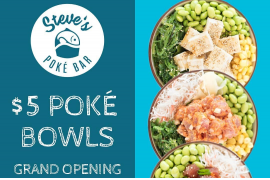 位于Coquitlam的Steve Poké Bar为庆祝开幕志庆,将于3月9日推出限时优惠:夏威夷传统鱼生饭(Poke)只卖$5(只适用于以下时段): 11:00 am - 8:00 pm 详情请按此浏览Steve Poké Bar Facebook网页 只限201...