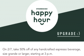 于2月7日(星期四)3pm 起,到Starbucks购买任何Espresso可享半价优惠,只限已登记的Starbucks会员 只限2019年2月7日