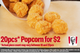 KFC推出限时优惠:Popcorn Chicken只卖$2 详情请按此阅览KFC Facebook网页 截止日期2019年1月17日4pm