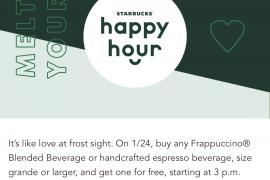 于1月24日(星期四)3pm 起,到Starbucks购买任何中杯装或以上Espresso/Frappuccino可享买一送一优惠,只限已登记的Starbucks会员 只限2019年1月24日...