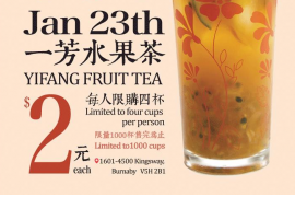 位于Burnaby Crystal Mall的一芳台湾水果茶为庆祝开幕志庆,将于今日(1月23日)推出限时优惠:购买水果茶只需$2 详情请按此浏览一芳台湾水果茶Facebook网页 只限2019年1月23日或额满即止 地址:#1601-4500 Kingsway, Bur...