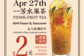 位于Fraser街的一芳台湾水果茶为庆祝开幕志庆,将于本周六(4月27日)推出限时优惠:购买水果茶只需$2 详情请按此浏览一芳台湾水果茶Facebook网页 只限2019年4月27日或额满即止 地址:6049 Fraser St, Vancouver (地图)